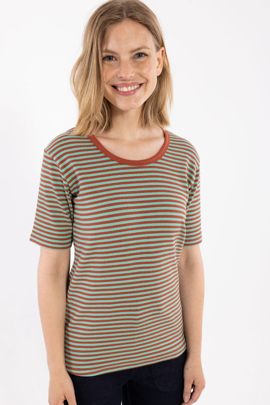Shirt Danerolemodel kurzarm Rib, geringelt in den Farben faded rust/mint von Danefae
