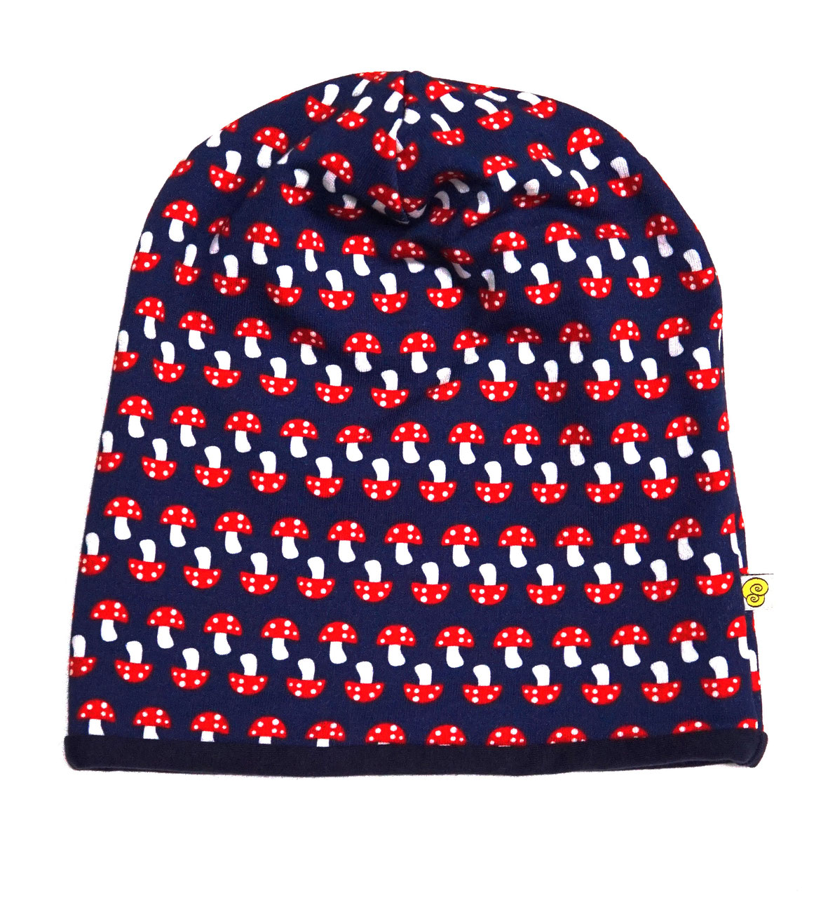 Reversible hat with lucky mushrooms, one side plain, the other side with colorful pattern